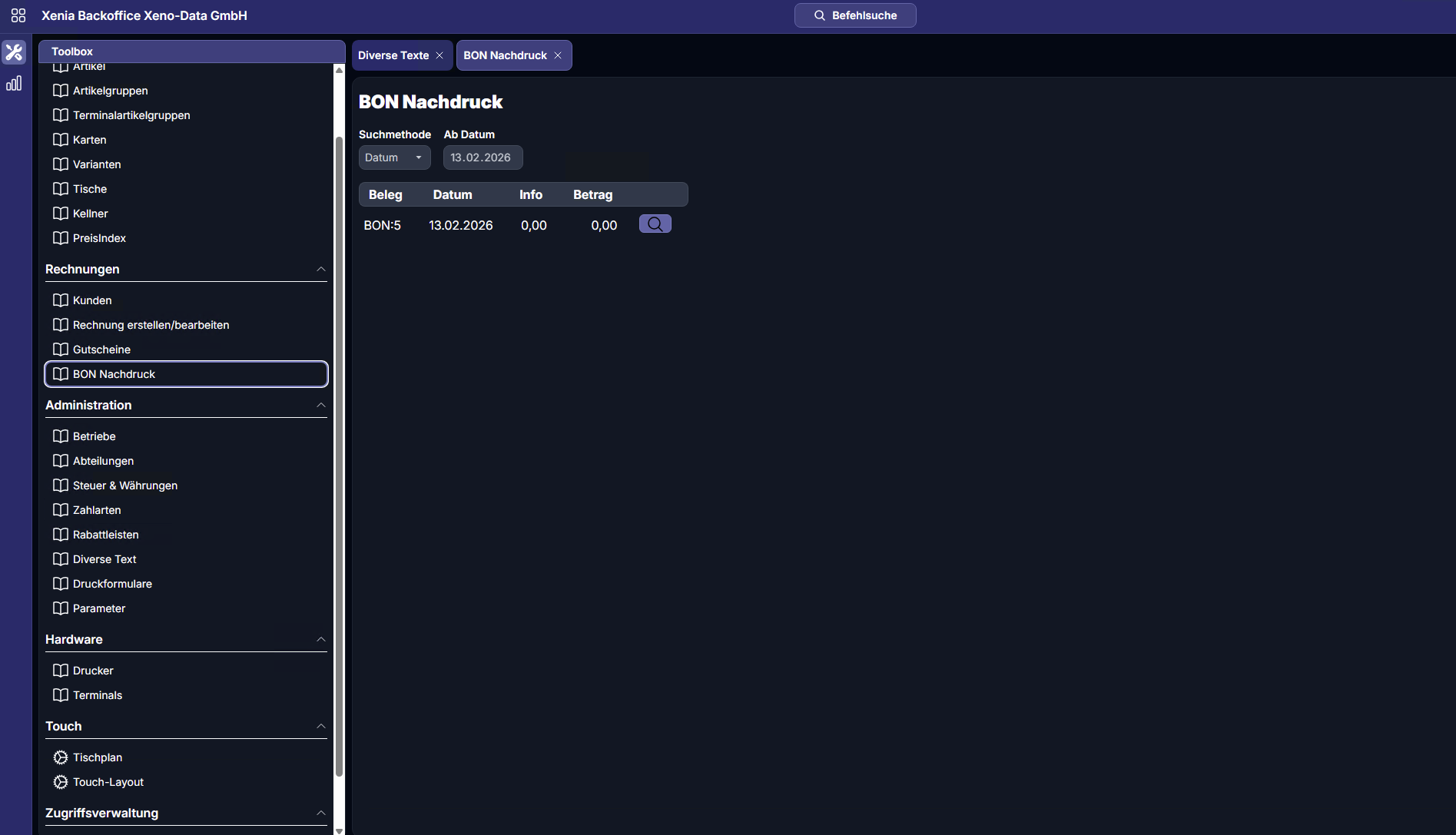 Das Modul BON Nachdruck ermöglicht es Ihnen, bereits abgeschlossene Verkaufsbelege (Bons) zu suchen, einzusehen und bei Bedarf erneut auszudrucken. Dies ist besonders hilfreich bei verloren gegangenen Quittungen oder zur nachträglichen Kontrolle von Transaktionen.