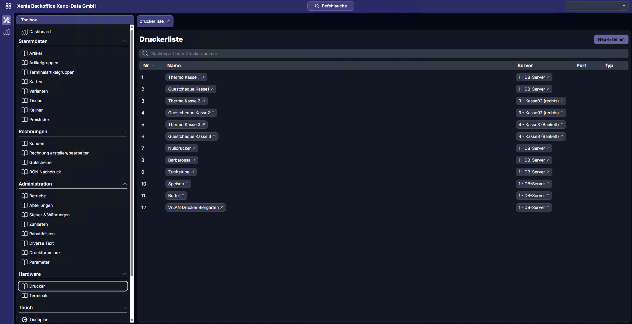 In diesem Modul verwalten Sie alle im System registrierten Drucker (Bondrucker, Küchendrucker, Rechnungsdrucker). Hier legen Sie fest, welcher Drucker über welchen Server angesprochen wird.