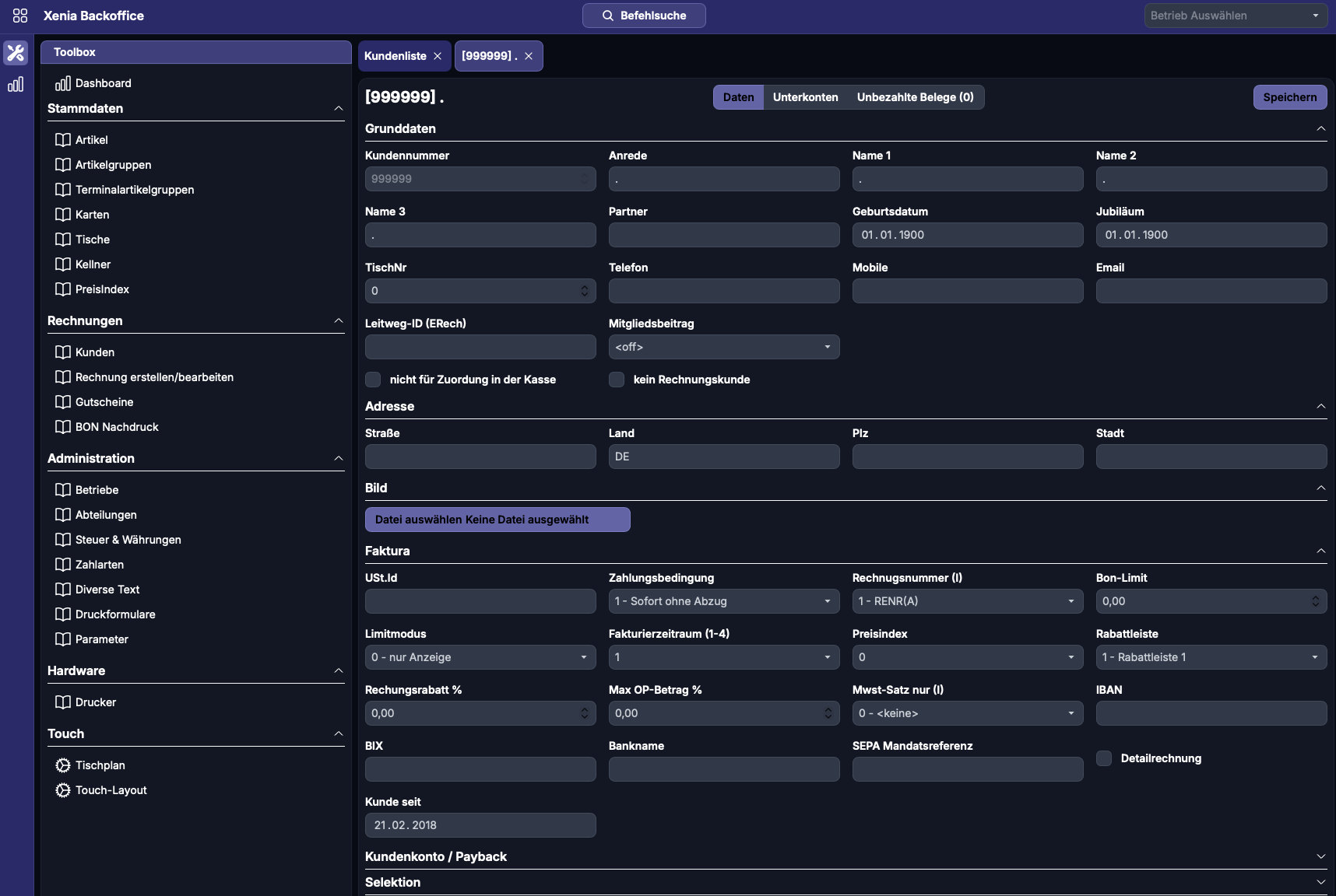 Diese Maske dient zur vollständigen Kundenverwaltung im Xenia Backoffice. Hier werden alle persönlichen Daten, Adressdaten, Rechnungsinformationen sowie buchungsrelevante Parameter hinterlegt. Die Struktur ist modular aufgebaut und bietet eine klare Trennung zwischen Stammdaten, Fakturaeinstellungen und Zusatzinformationen.