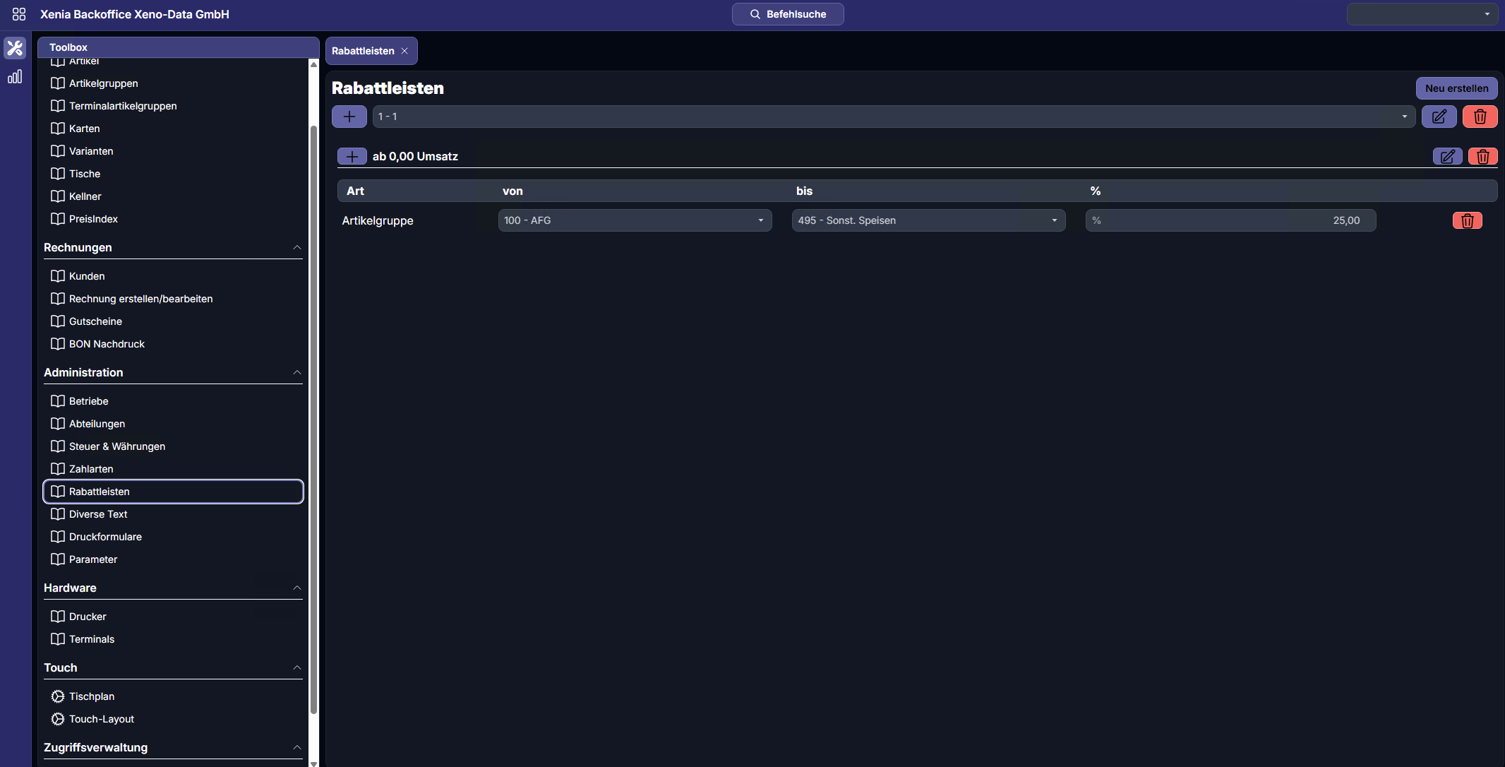Das Modul Rabattlisten dient zur Verwaltung automatischer oder umsatzabhängiger Rabatte im Kassensystem.