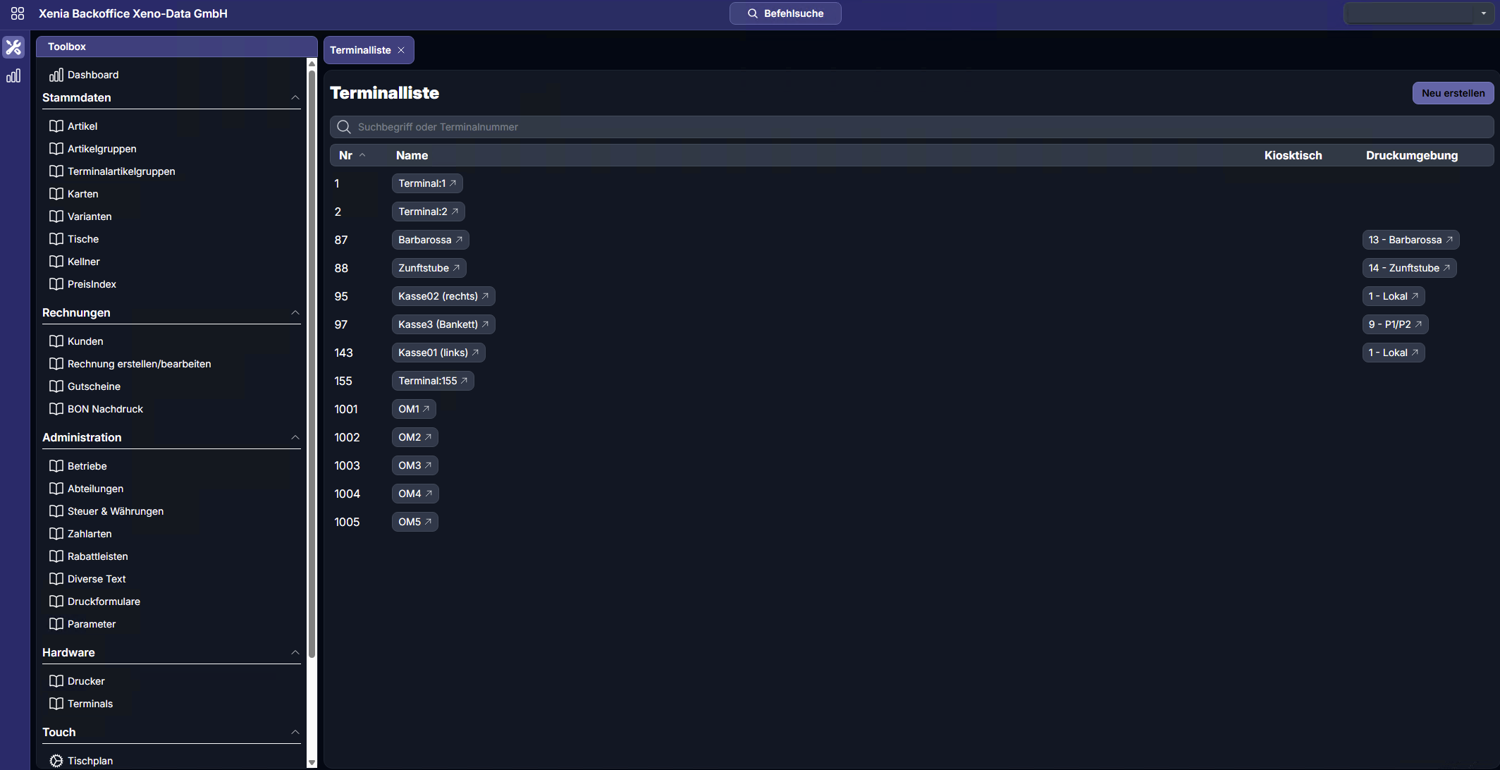 In diesem Modul verwalten Sie die verschiedenen Eingabegeräte und Kassenstationen (Terminals) Ihres Systems. Hier legen Sie fest, welche Hardware-Einheiten aktiv sind und in welcher Druckumgebung sie operieren.
