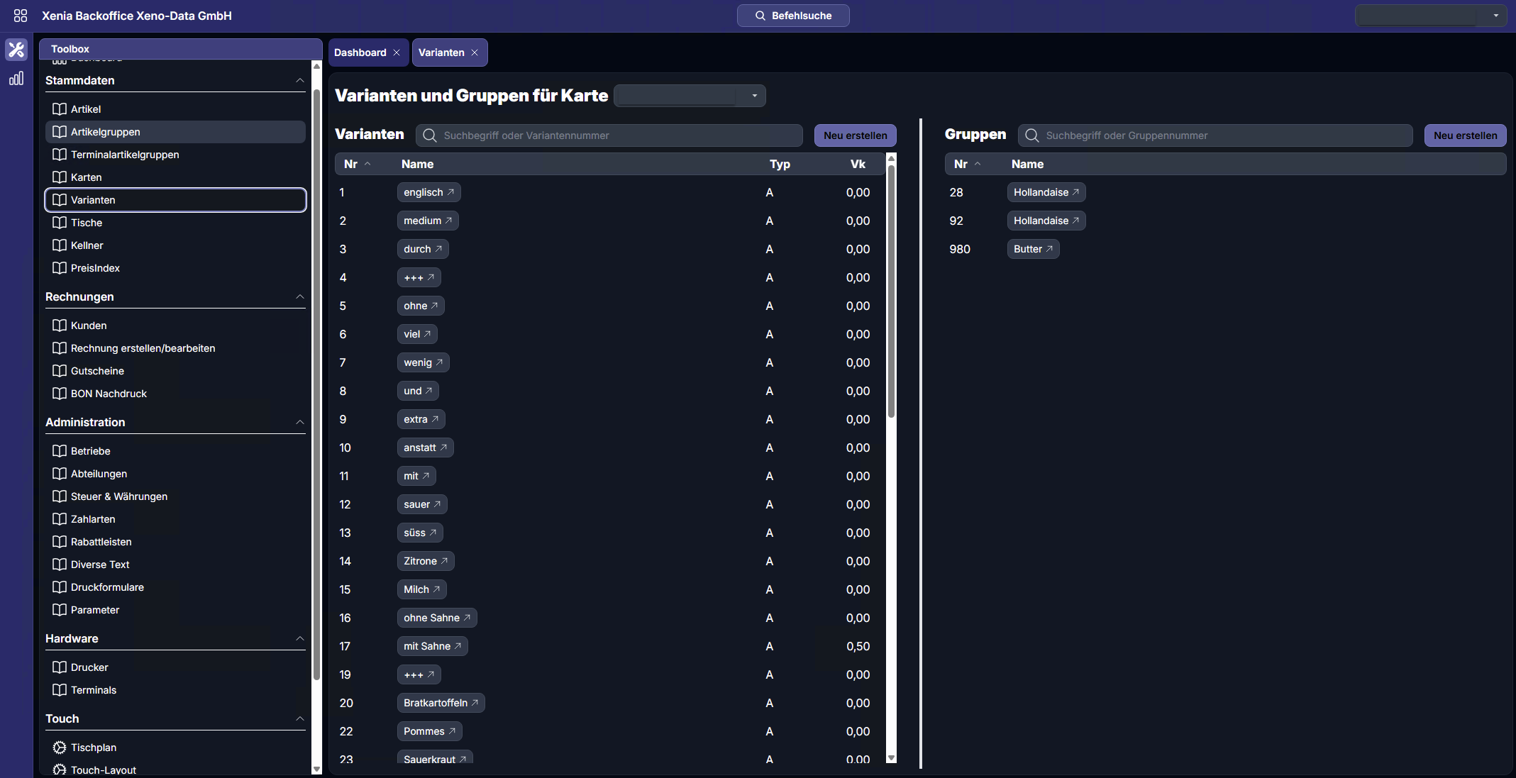 Der Bereich Varianten dient zur Definition von Zusatzoptionen oder Auswahlmöglichkeiten für Artikel. Varianten werden typischerweise eingesetzt um Bestelloptionen wie Garstufen, Beilagen, Zusätze oder Abwandlungen (z. B. „ohne“, „extra“, „mit Sahne“) abzubilden. Sie können Artikeln und Karten zugewiesen werden und stehen anschließend an den Kassen und Terminals zur Auswahl bereit.