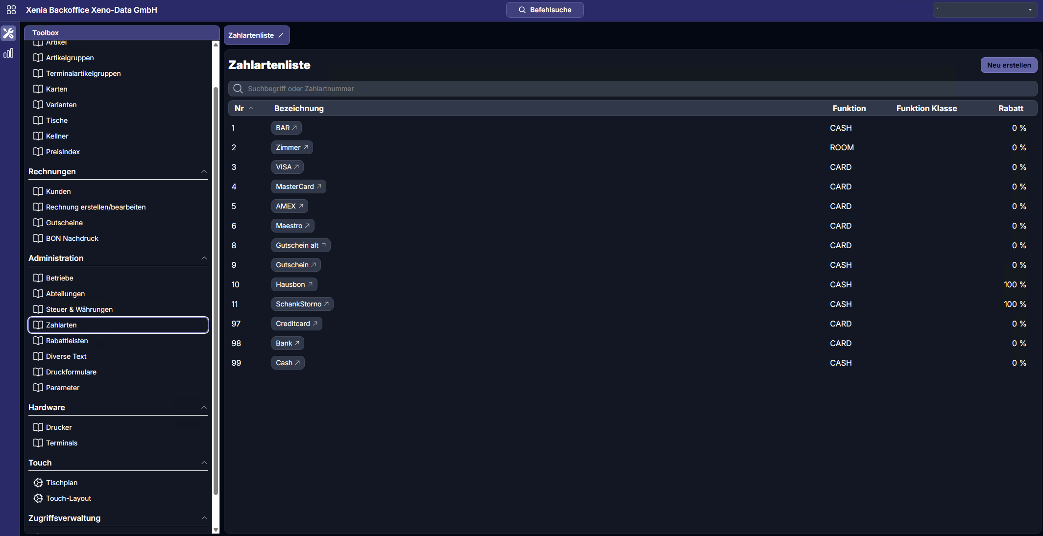Das Modul Zahlarten dient zur Verwaltung aller im Kassensystem verfügbaren Zahlungsarten.